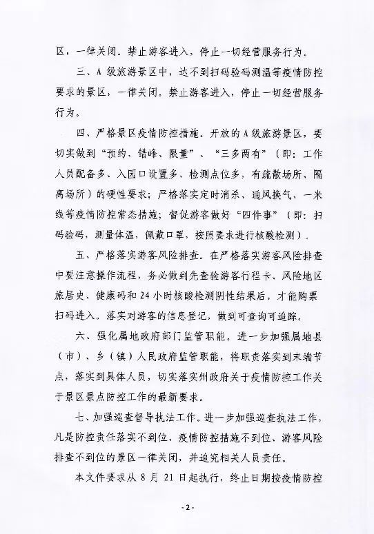 非A级旅游景区景点(包括未开放景区景点),一律关闭。禁止游客进入,停止一切经营服务行为。