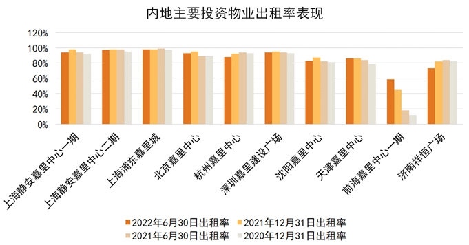 报告期末,嘉里建设内地主要投资物业平均出租率为87%,较2021年末的88%出现轻微下降。2022年3-5月由于零星疫情爆发,内地整体零售业务表现疲软,同时上海封城期间大部分时间里客流量处于停滞阶段。内地写字楼业务收入及出租率表现较为坚挺,报告期末,写字楼物业出租率维持高位水平,其中静安嘉里中心的出租率为99%、浦东嘉里城为100%、北京嘉里中心为96%、杭州嘉里中心为82%,以及深圳嘉里建设广场为93%。